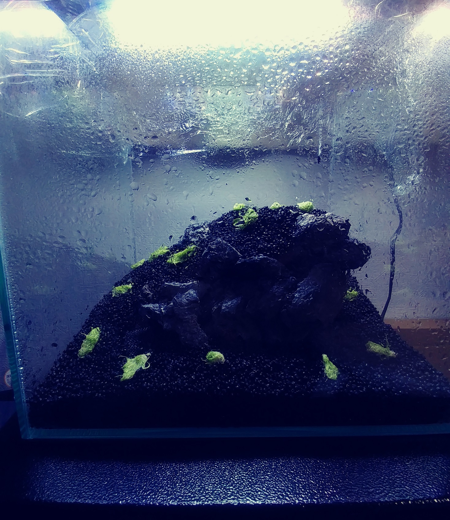 ↑上から 真ん中にソイルで丘を作りました。 ソイルに霧吹きしながら山のように盛ったの で、ガラス面が濡れて見えずらいですが、崩 れることなく安定させることができました。