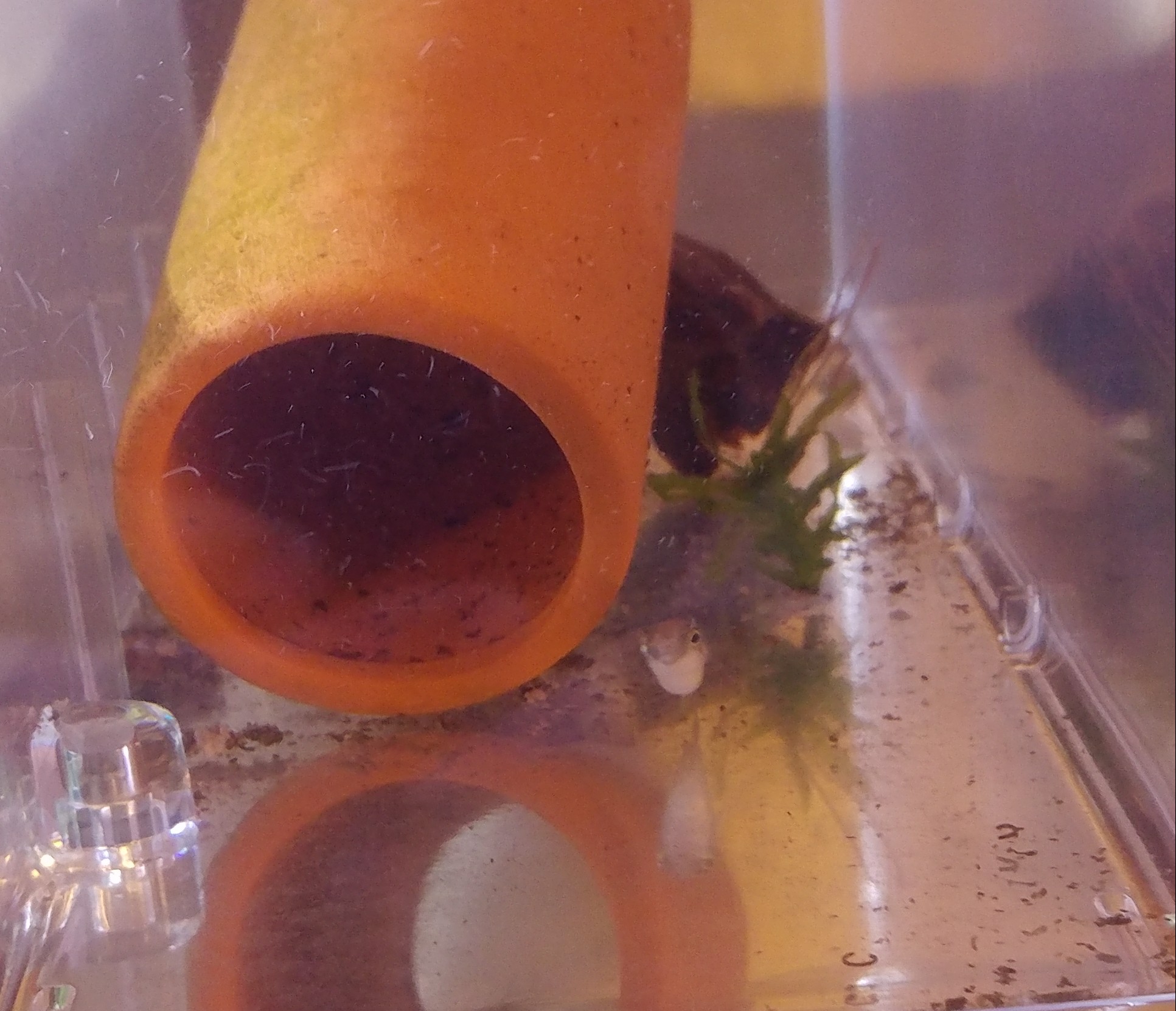 こっちを見ている時はすぐにわかる。 特に土管を占領している個体は人懐っこく、 餌も2日目からピンセットで与える事が出来 た。 土管の下にいる子はすごくマイペースだ。 この時は餌付かない2匹の為にいろいろな餌 を投入していたのだが、土管下の子は完全無 視で体に餌が乗ってしまっている。 奥の子はシャイでおとなしい。 この子はもしかすると丘水槽に入れても他の 熱帯魚を襲わないかもと思い移動してみた。